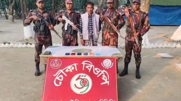 জিহাদুল ইসলাম (জিহাদ) স্টাফ রিপোর্টার চাঁপাইনবাবগঞ্জে মহানন্দা ব্যাটালিয়ন ৫৯ বিজিবির বিশেষ গোপন সংবাদের ভিত্তিতে ব্যাটালিয়নের অধীনস্থ চৌকা বিওপি’র একটি বিশেষ টহল দল বেলা ০২:৪৫ ঘটিকায় বিওপি’র দায়িত্বপূর্ণ এলাকায় এ অভিযান